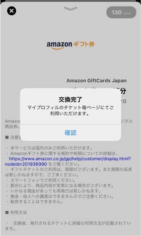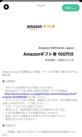 今回は130コインを使ってAmazonギフト券に交換します
